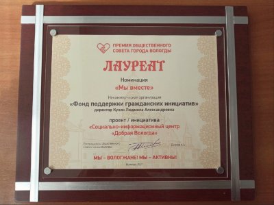 Некоммерческая организация "Фонд поддержки гражданских инициатив" стала лауреатом в номинации "Мы вместе" с проектом "Социально-информационный центр Добрая Вологда".